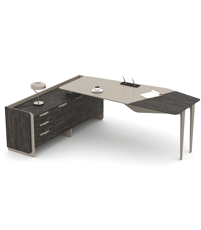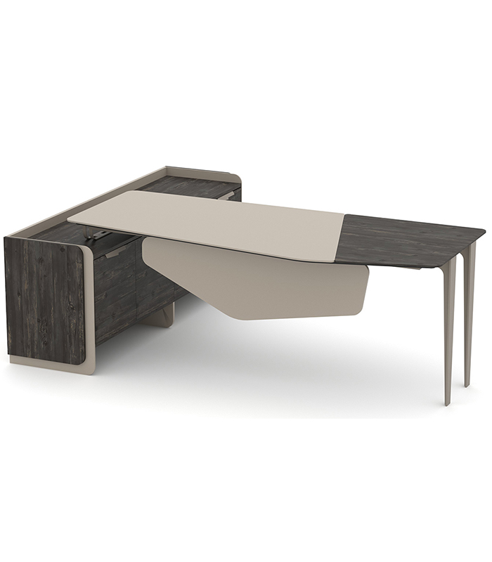 Corte Yönetici Takımı, asimetrik detayları ve zarif tasarımı ile fark yaratıyor. Masanın ön kısmında kullanılan açık renkli metal malzeme, tasarıma hareketlilik kazandırırken aynı zamanda sofistike bir görünüm sağlıyor. Asimetrik detaylar, takıma modern bir hava katmakla kalmıyor aynı zamanda odanın genel atmosferine özgün bir dokunuş ekliyor.